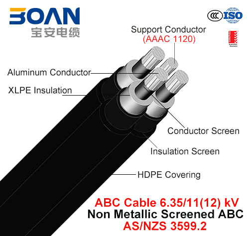 HV ABC Cable, Aerial Bundled Cable, Non Metallic, 6.35/11 kV (AS/NZS 3599.2)Non Metallic Screened HV ABCConductorsPhase conductors are stranded circular compacted aluminium alloy 1350 to H68 condition. T......
